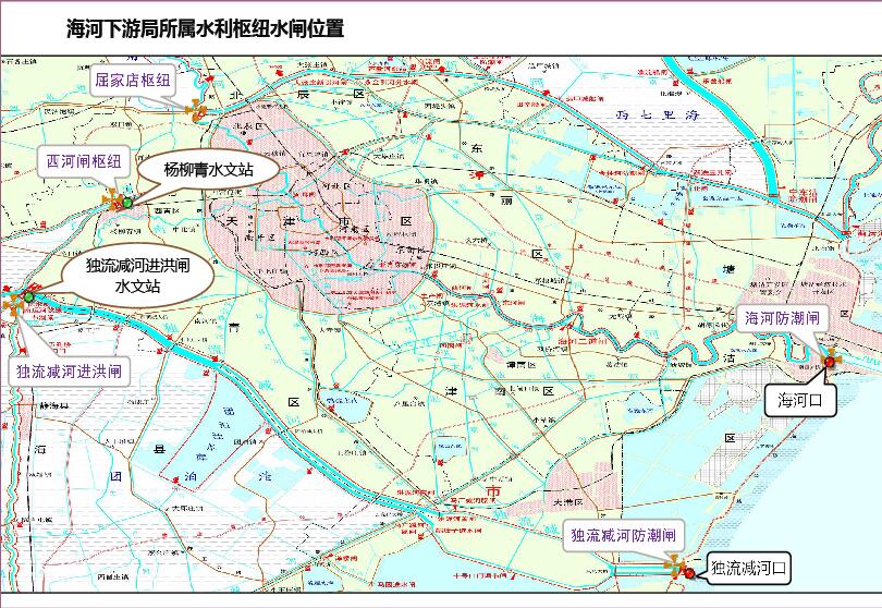 其中坐落于天津市区周边的五座大型水闸工程——西河闸枢纽、屈家店枢纽、海河防潮闸、独流减河进洪闸枢纽和独流减河防潮闸,因其特殊地理位置和省际间关系协调,由水利部海河水利委员会海河下游局实施管理。天津境内的其他水闸则视地理位置和规模等级,分别由天津市地方水务部门管理。