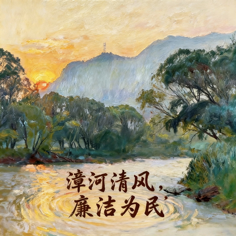设计说明:以油画风格呈现漳河黄昏景致,山水林木晕染自然气韵,“漳河清风,廉洁为民”的文字与澄澈水景呼应,借自然之清透传递廉洁奉公、为民服务的价值追求。