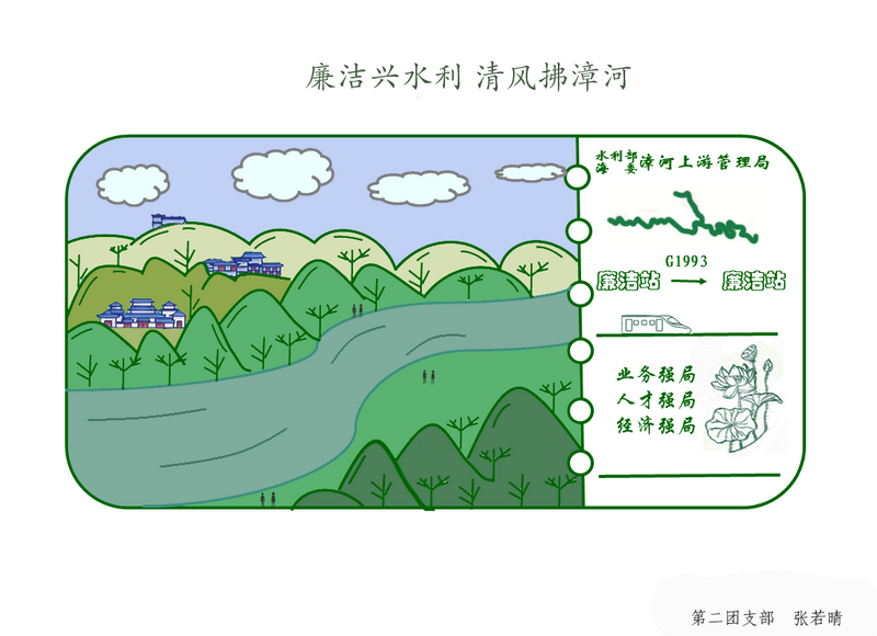 设计说明:画面左侧,漳河两岸山峦叠翠、水波潋滟,尽显风清气正的生态;右侧,车票与河系图的组合,代表我局自成立以来,廉洁理念便贯穿水利工作全流程。漳河上游局始终锚定“三个强局”建设目标,以廉洁之治为重要抓手,推动水利事业行稳致远,让廉洁清风持续润泽漳河之畔。 |