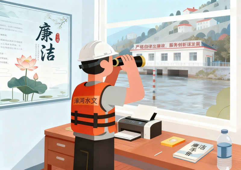 设计说明 :本漫画以我局基层水文站2025年汛期测流照片为原型,还原工作人员穿救生衣、持望远镜在河道旁记录水位的场景。背景“严格自律出廉政,服务创新谋发展”标语自然融入,结合写实动作与主题元素,既显基层水文工作艰辛,更以小见大,凸显廉政文化与一线工作融合,让廉洁理念扎根基层。 |